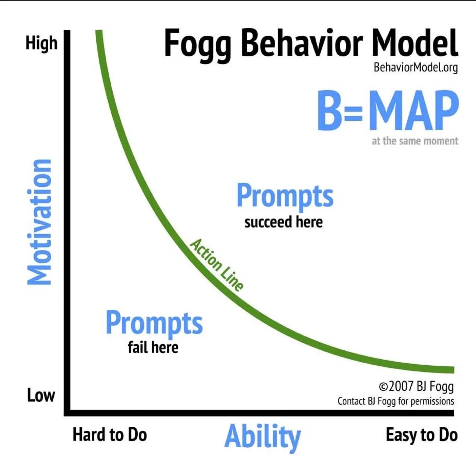 To help learners cross this gap, we can look at models like the Fogg Behavior Model. This model is often used to enshittify the internet with advertising and attention-grabbing products, which is not great, but it can also be used for good.
