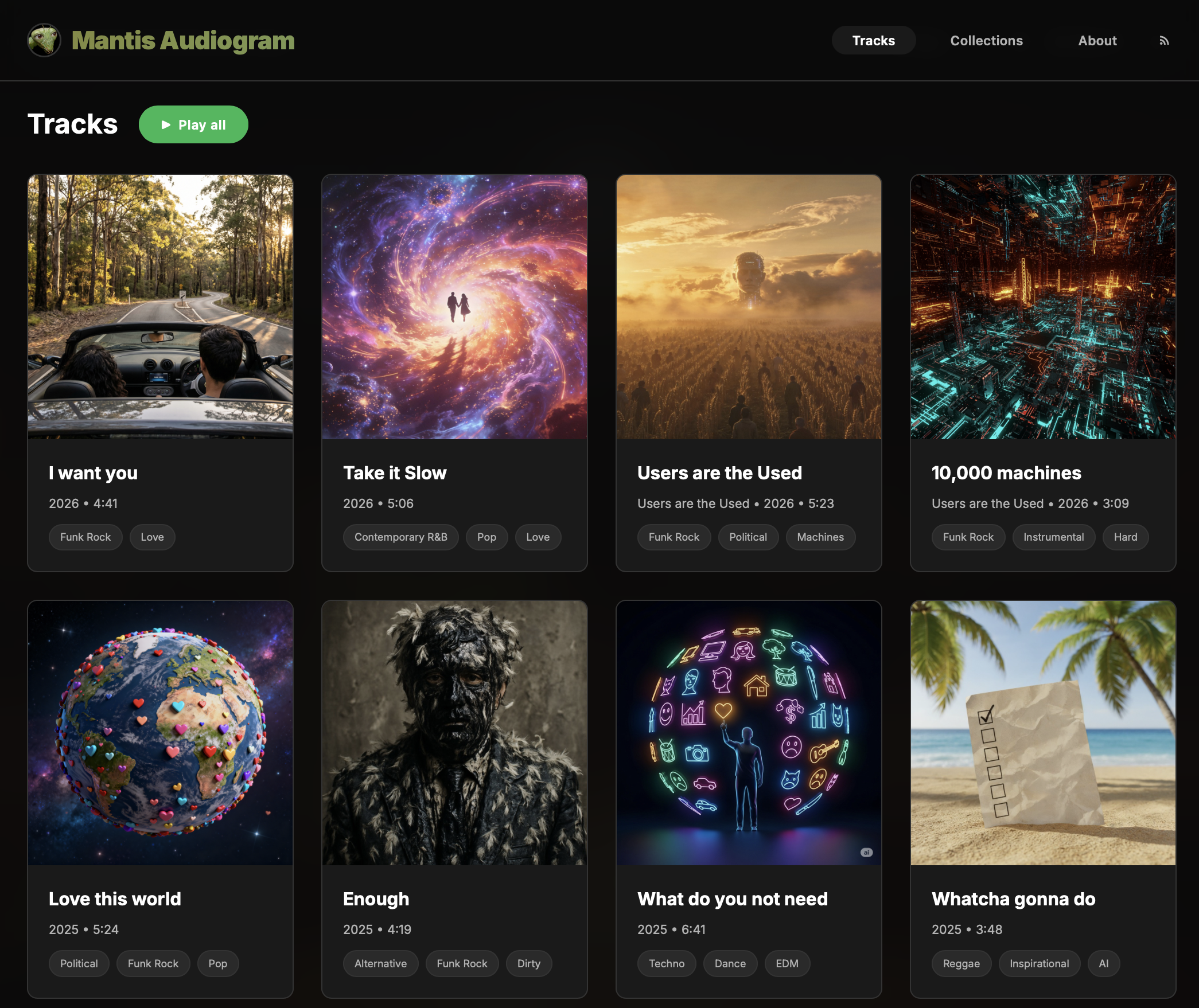 You can explore most of my published music here on my band site mantisaudiogram.music (most of it is also available on popular streaming platforms).
